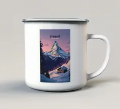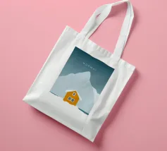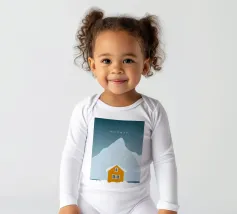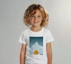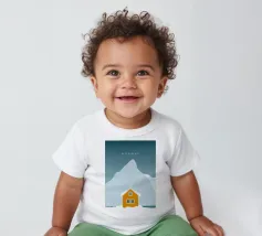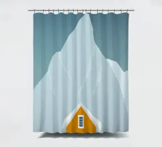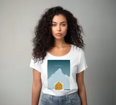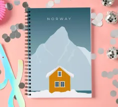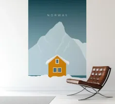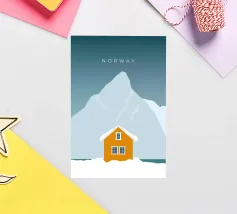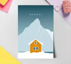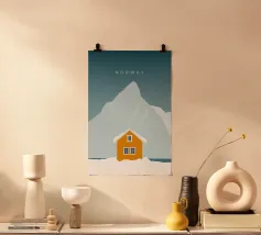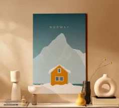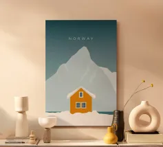 Design minimalista della Norvegia con una piccola capanna gialla sulla costa norvegese delle Isole Lofoten con le montagne sullo sfondo. Tipico cottage scandinavo coperto di neve e paesaggio montano invernale nel nord della Norvegia.