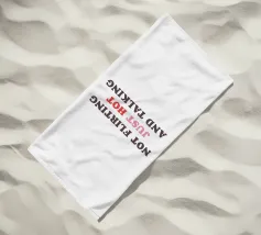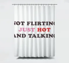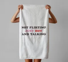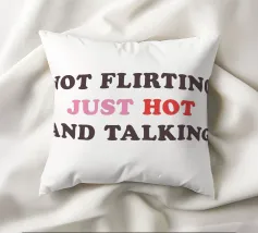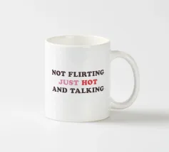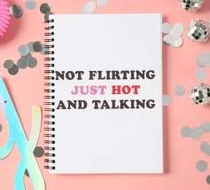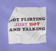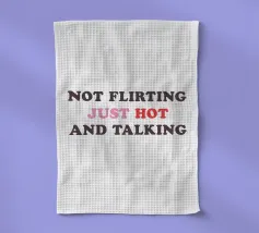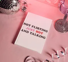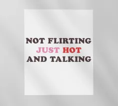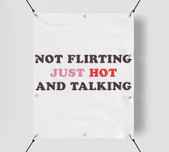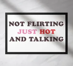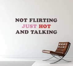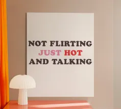 Un testo in grassetto con caratteri in stile retrò recita: "NOT FLIRTING JUST HOT AND TALKING". Le parole "JUST" e "HOT" sono evidenziate rispettivamente in rosa e in rosso.