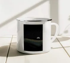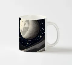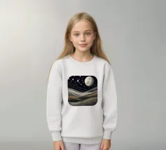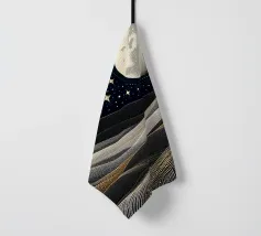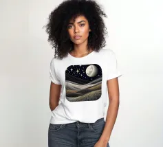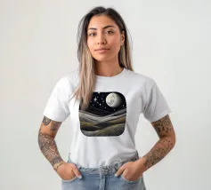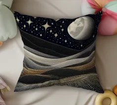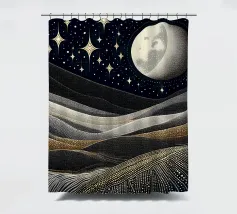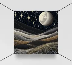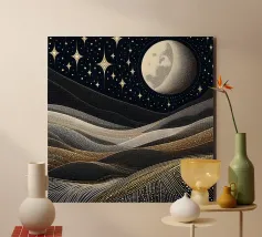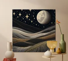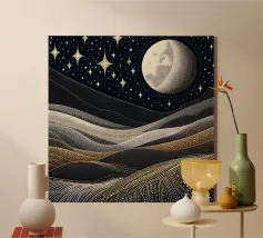 Stupendo paesaggio del cielo notturno con luna splendente e stelle scintillanti, con fluide colline ingioiellate dall'effetto metallico nei colori argento e oro, su sfondo nero. Perfetto per gli amanti dello spazio!