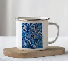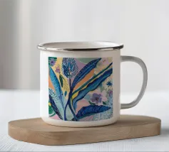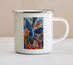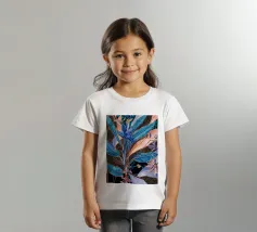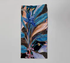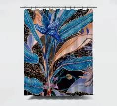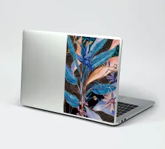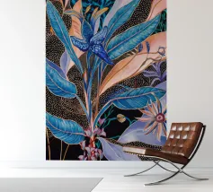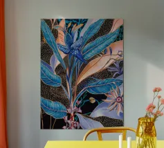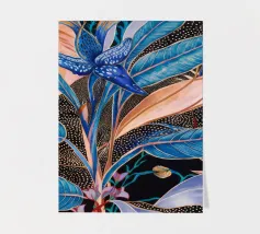 Raffigurazione stilizzata di una pianta tropicale con foglie blu e accenti floreali rosa o viola, su uno sfondo scuro illuminato da punti dorati sparsi, che creano un effetto di fioritura notturna.