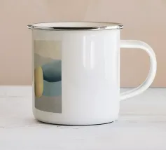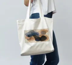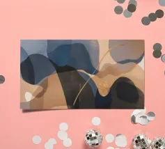 Composizione astratta minimalista con forme traslucide sovrapposte e orientate orizzontalmente di colore blu scuro o nero, ocra e beige su uno sfondo neutro chiaro.