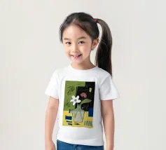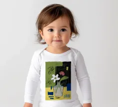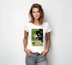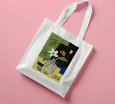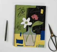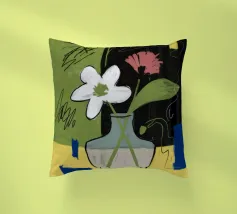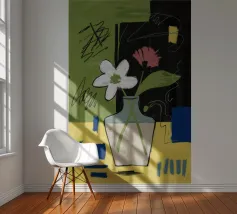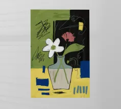 Una natura morta astratta su sfondo scuro con un singolo fiore bianco in un vaso giallo e blu, con forme e linee espressive e gestuali.