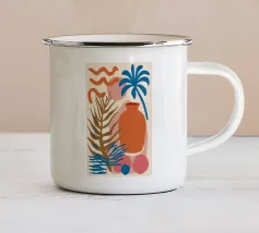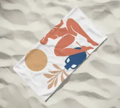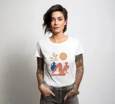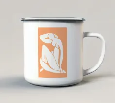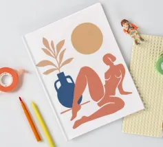 Una composizione astratta minimalista ed elegante, ispirata a Maraoui, con una figura nuda, un vaso e una foglia in una tavolozza di colori caldi e terrosi. L'opera è una celebrazione serena e sofisticata della forma umana.