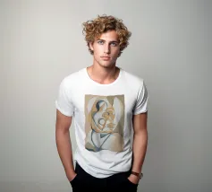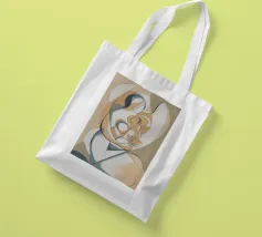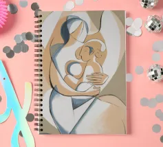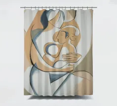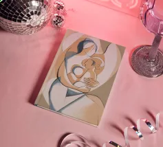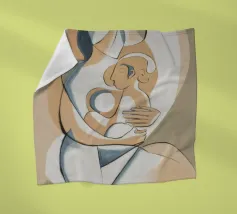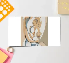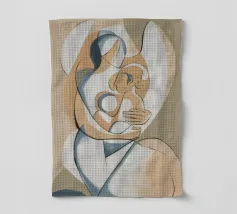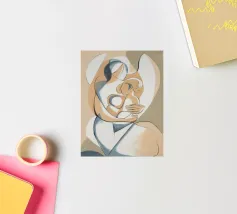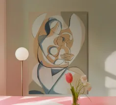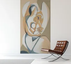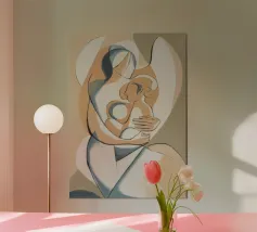 Quest'opera d'arte presenta figure astratte in una posa di accudimento, con un mix di colori beige, blu e bianchi. La composizione è calda e confortante.