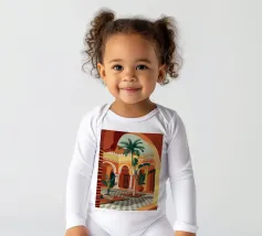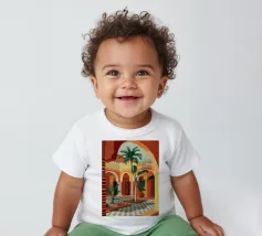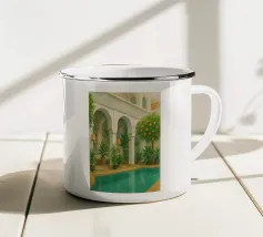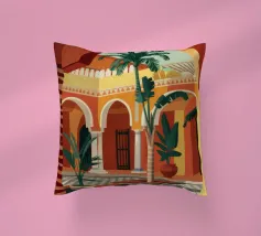 Illustrazione di un bellissimo cortile piastrellato con archi e piante rigogliose. La scena è una rappresentazione serena, tranquilla ed elegante di un'oasi marocchina o mediterranea nascosta.