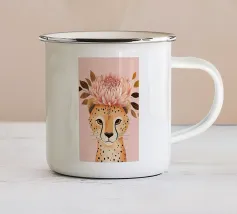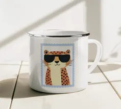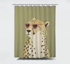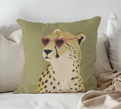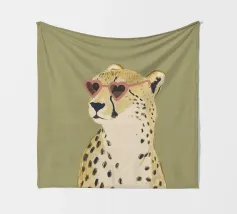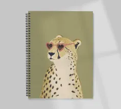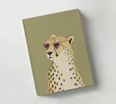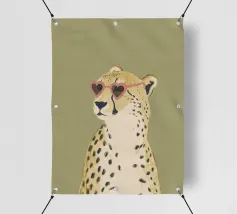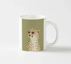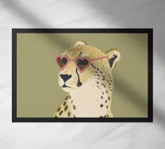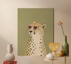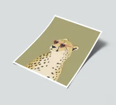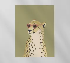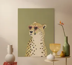 Questa simpatica illustrazione di un ghepardo con occhiali da sole a forma di cuore porta umorismo e gioia nel mondo animale. La tavolozza di colori minimalista di verde salvia, beige e marrone sottolinea il carattere carismatico dell'animale selvatico. Ideale per qualsiasi interno, crea una divertente sensazione di safari piena di amore!