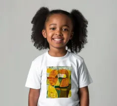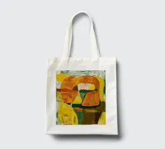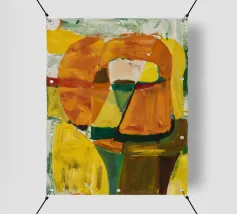 Un'audace composizione astratta dominata da una grande forma circolare o simile a un oculo in arancioni e gialli infuocati, con verdi e rossi circostanti, che suggerisce una fioritura solare o una potente fonte di energia centrale. Stile De Stael.