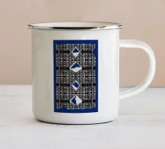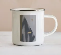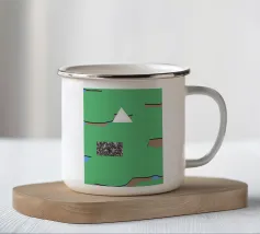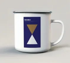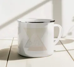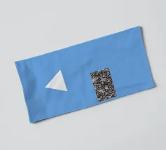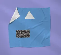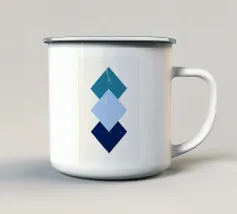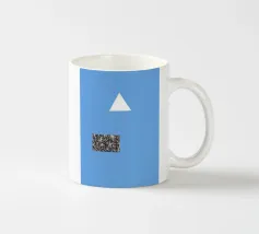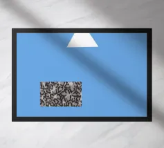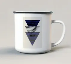 Un triangolo bianco fluttua sopra un motivo rettangolare in bianco e nero su uno sfondo blu pieno. La composizione è minimalista, con colori contrastanti e forme geometriche che creano interesse visivo.