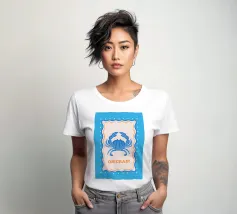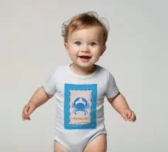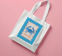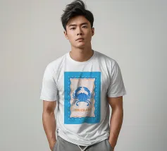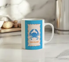 Granchio decorativo blu con cornice su sfondo blu turchese. Con il testo Oh Crab! Perfetto per aggiungere un po' di atmosfera da spiaggia al vostro spazio!