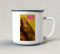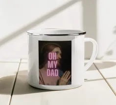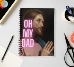 Una persona con capelli lunghi e barba è raffigurata in una posa classica con le mani giunte in preghiera. Un grande testo rosa sovrasta l'immagine e recita "OH MY DAD".