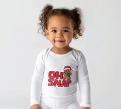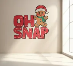 Un allegro personaggio di pan di zenzero che indossa un cappello e una sciarpa da Babbo Natale è affiancato dalla scherzosa frase "OH SNAP" in lettere rosse.