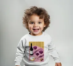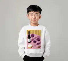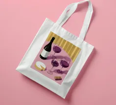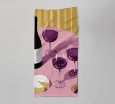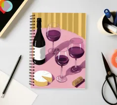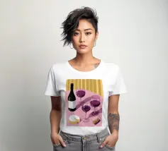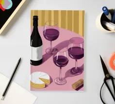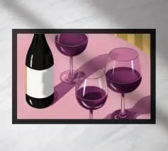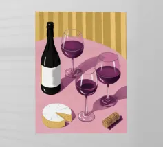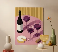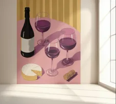 Una sofisticata natura morta con tre bicchieri di vino rosso e un blocco di formaggio su un tavolo. Le ombre forti e drammatiche creano una composizione lunatica, elegante e moderna con un'atmosfera senza tempo.