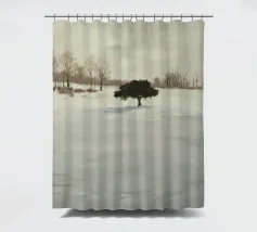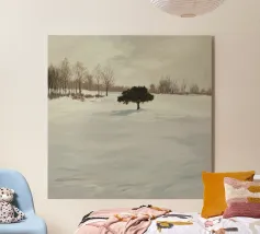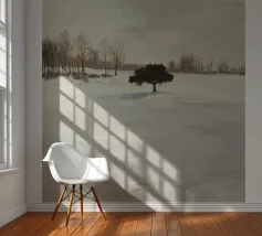 Un singolo albero proietta una lunga ombra sulla neve incontaminata, evocando la solitudine nel silenzio invernale.