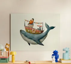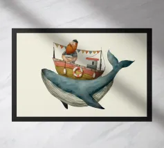 Un poster stravagante con un marinaio barbuto su un peschereccio colorato trasportato da una balena gigante. Questa affascinante opera d'arte nautica in stile acquerello aggiunge un tocco di fantasia e narrazione alle camere dei bambini, alle case al mare o agli interni ispirati all'oceano.