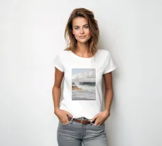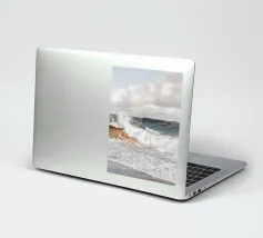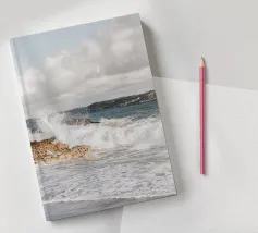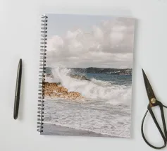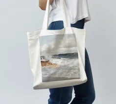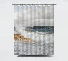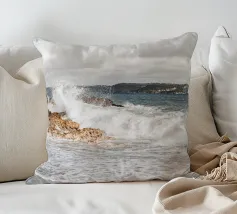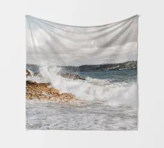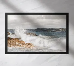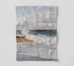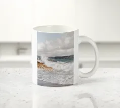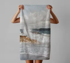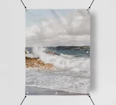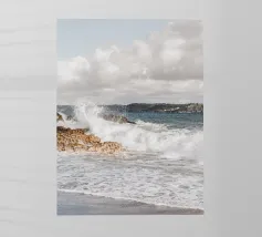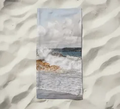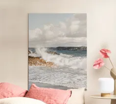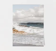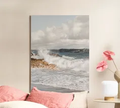 Una foto straordinaria che cattura le potenti onde dell'Oceano Atlantico contro le scogliere rocciose e presenta la vastità del paesaggio costiero in uno stile boho. Lo scenario marittimo con nuvole e spiaggia sabbiosa aggiunge un tocco artistico all'immagine.
