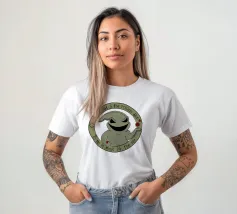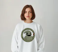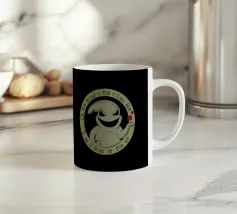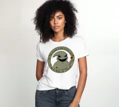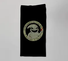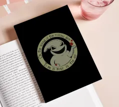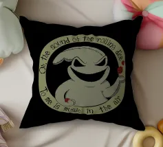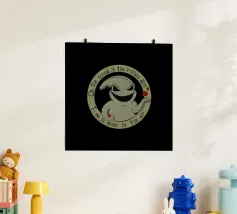 Un boggart giallo che tiene un dado in una mano e lancia due dadi nell'altra, intorno a lui è scritto un estratto della canzone del film Nightmare Before Christmas "Oh, il suono dei dadi che rotolano per me è musica nell'aria". Questo disegno rende omaggio all'iconico Oogie Boogie del film Nightmare Before Christmas. Regalate a chi ama questo film questa simpatica e spaventosa arte dell'Uomo Nero.