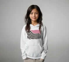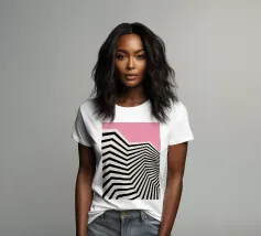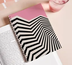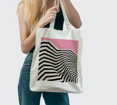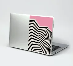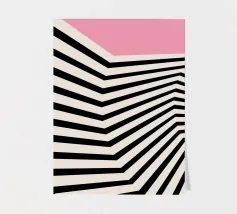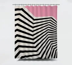 Accattivante motivo op-art con zigzag neri su sfondo rosa pallido. Questo disegno dinamico dona movimento ed energia a qualsiasi ambiente, ideale per murales, accessori di moda o tessuti per la casa con un look moderno e retrò.