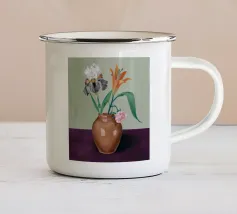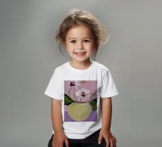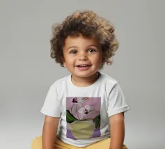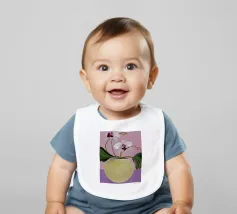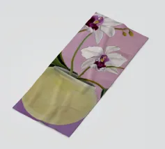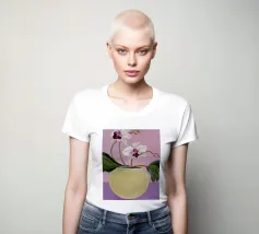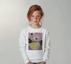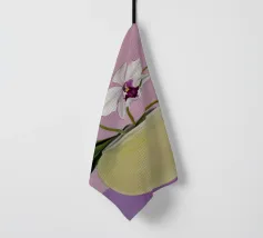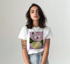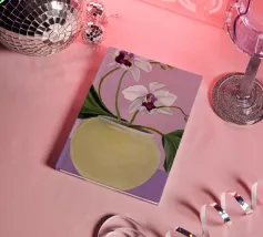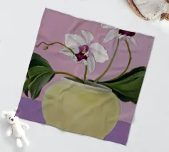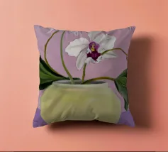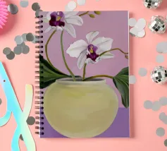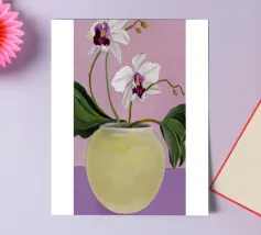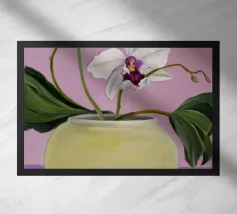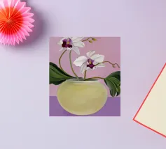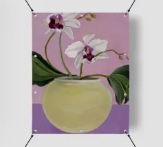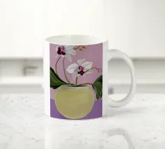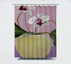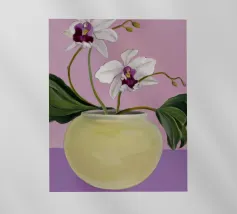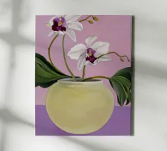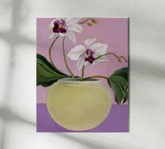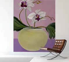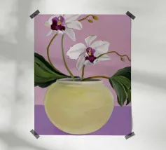 Un semplice vaso arrotondato di colore giallo pallido racchiude delicate orchidee bianche e viola su uno sfondo color malva che ne sottolinea la forma aggraziata.