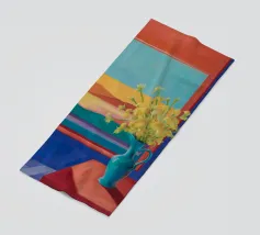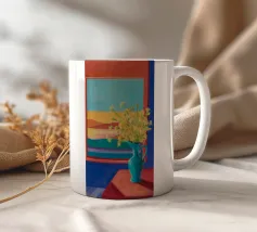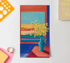 Un vaso blu di fiori gialli risplende davanti al dipinto di un tramonto dorato, fondendo natura e arte in toni radiosi.