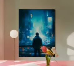 Entrate in un vivido paesaggio da sogno cyberpunk dove l'architettura futuristica incontra cieli luminosi e impregnati di neon. Quest'opera d'arte cattura la solitudine e la meraviglia di trovarsi in mezzo a una metropoli tentacolare, invitando a riflettere sull'intersezione tra tecnologia, umanità e immaginazione. Perfetta per gli interni moderni che cercano una dichiarazione audace e d'atmosfera.