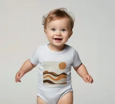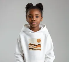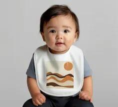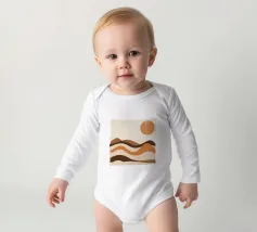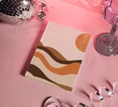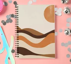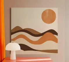 Quest'opera d'arte astratta minimalista presenta colline ondulate in toni caldi e terrosi, sullo sfondo di un vibrante sole arancione. Il design semplice ma d'impatto evoca sensazioni di tranquillità e bellezza naturale.