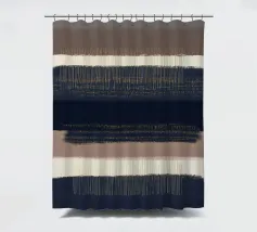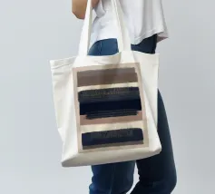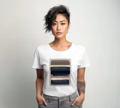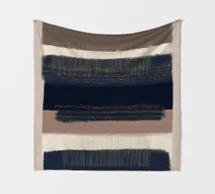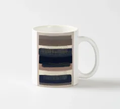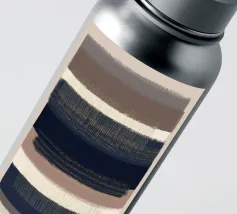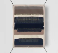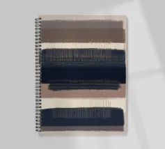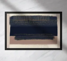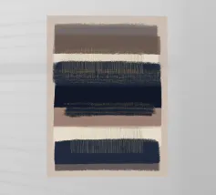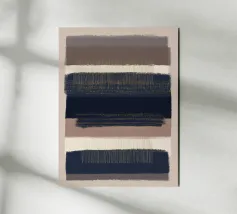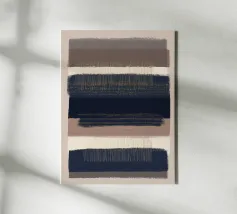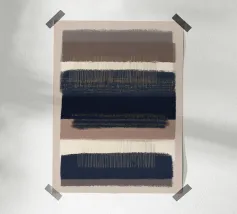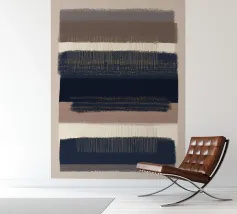 Motivo astratto e minimalista con strisce orizzontali di colore nelle calde tonalità del beige, del marrone e del blu, intervallate da sottili linee dorate. La tranquilla composizione ha un aspetto moderno ed elegante e trasmette equilibrio, profondità ed estetica senza tempo.