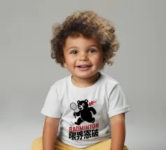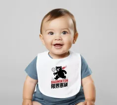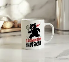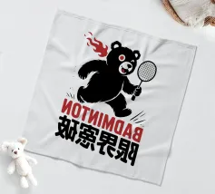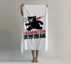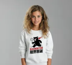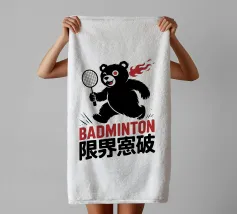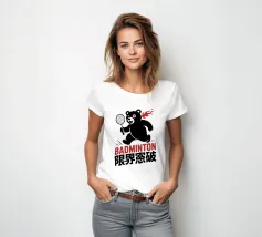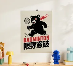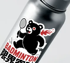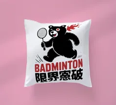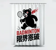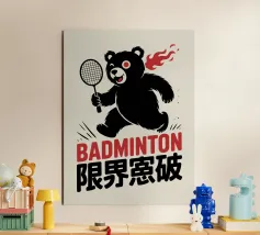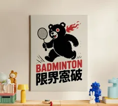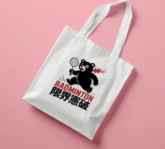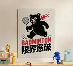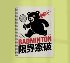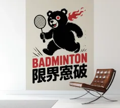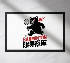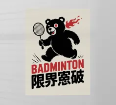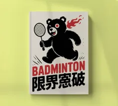 Intenso disegno a tema badminton con un orso nero determinato che impugna una racchetta da badminton a metà del suo movimento. Il kanji "限界突破" (Limit Break) riflette la mentalità competitiva di agilità, velocità e precisione. Una miscela unica di stile street giapponese e dell'energia dinamica del badminton.