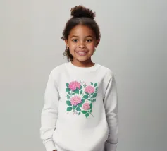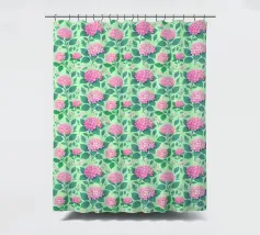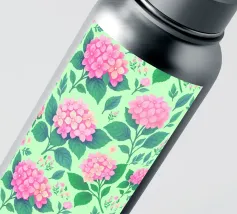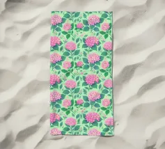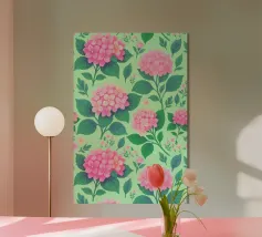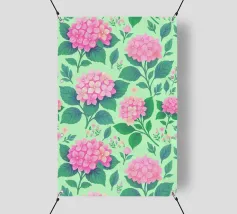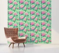 Elegante motivo floreale con fiori di ortensia rosa chiaro e foglie verdi su sfondo verde menta.