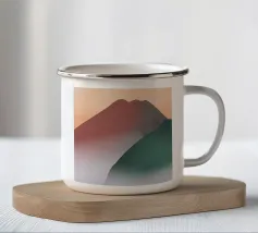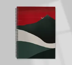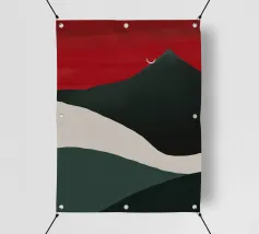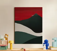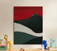 Un paesaggio stilizzato presenta una montagna scura sotto un cielo rosso vibrante con una delicata luna crescente sopra. La scena è semplificata da forme audaci e colori contrastanti per creare una composizione astratta.