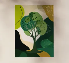 Questo pezzo astratto presenta un albero stilizzato al centro, con fogliame verde e macchie scure e giocose che imitano la luce e le bacche. Il paesaggio circostante è una vibrante e moderna interpretazione della natura, con forme organiche nei toni dell'oliva, del lime e del verde bosco intenso. Tocchi di oro e crema creano uno sfondo caldo e invitante, mentre i motivi strutturati, dai puntini fini alle volute granulose, aggiungono profondità e interesse visivo. Quest'opera d'arte è in grado di creare un effetto sorprendente e sofisticato in qualsiasi spazio abitativo o ufficio contemporaneo, portando un senso di calma e naturalezza.