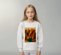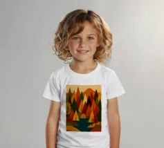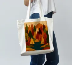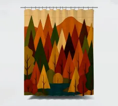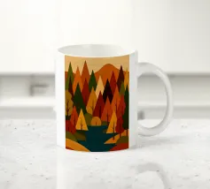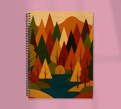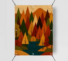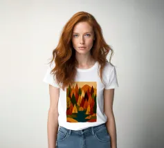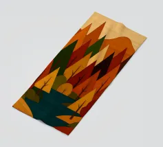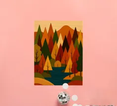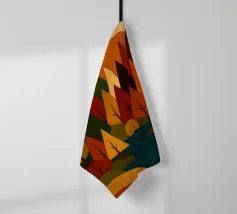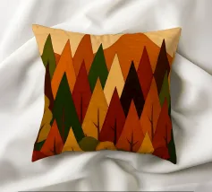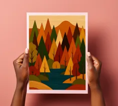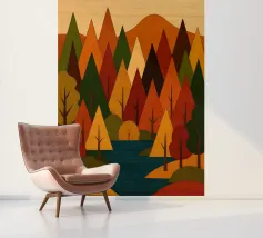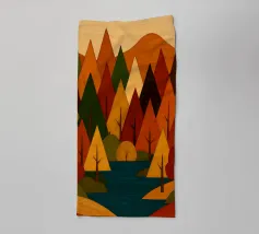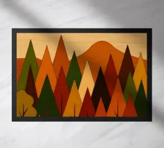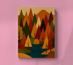 L'effetto artistico della texture in legno unifica la composizione, dando l'impressione che si tratti di un'opera d'arte in legno intagliata o intarsiata, che aggiunge una qualità tattile e artigianale. L'essenza di un paesaggio forestale autunnale attraverso un approccio geometrico stilizzato. Le forme triangolari dominano la composizione, imitando la forma di pini e alberi decidui in varie tonalità calde - verdi profondi, arancioni bruciati, marroni ricchi e gialli dorati - che evocano i colori mutevoli del fogliame autunnale. La tavolozza dei colori è terrosa e rafforza il tema stagionale, dando un senso di calore e tranquillità.