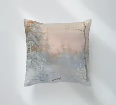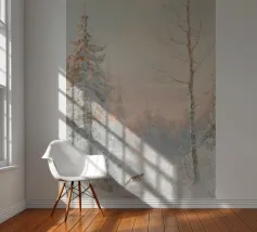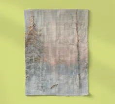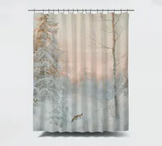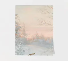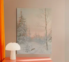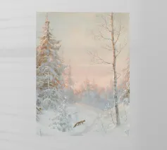Pittura del paesaggio forestale invernale, bosco innevato con volpe Stampa d'arte da parete