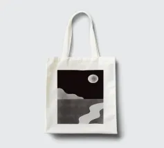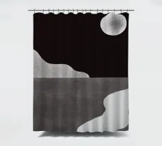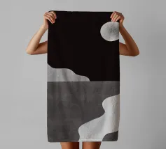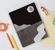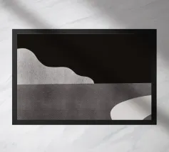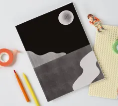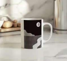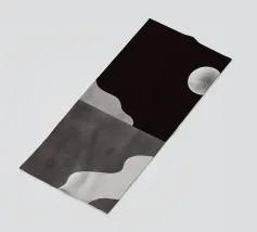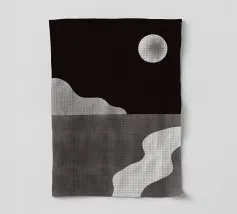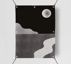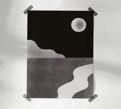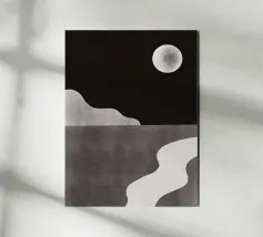 Un paesaggio minimalista è caratterizzato da una forma celeste rotonda che ricorda la luna e che si libra sopra forme astratte del terreno. I toni monocromatici e le semplici forme geometriche trasmettono una scena serena e contemplativa.
