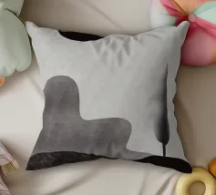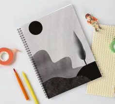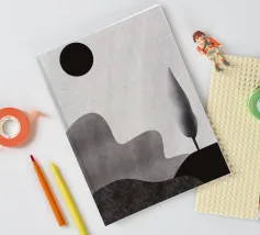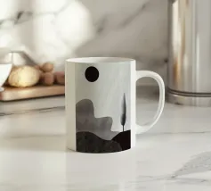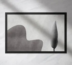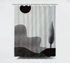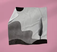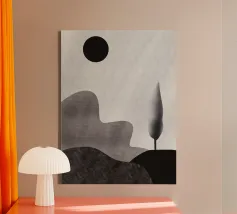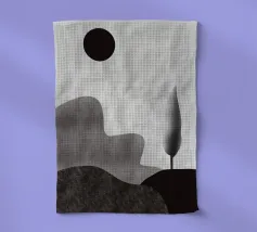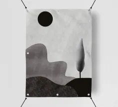 Le forme monocromatiche creano un paesaggio minimalista con un singolo albero e un grande elemento circolare che ricorda il sole. Morbidi gradienti e bordi lisci aggiungono un'atmosfera serena e astratta.