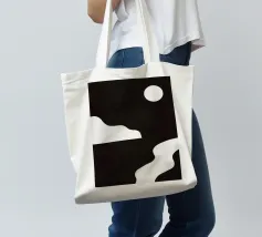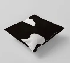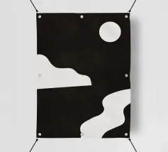 Un design minimalista in bianco e nero presenta forme astratte che ricordano un sole, nuvole e una linea ondulata. La composizione crea un netto contrasto tra lo sfondo scuro e gli elementi geometrici chiari.