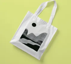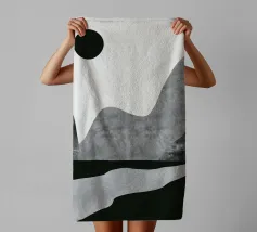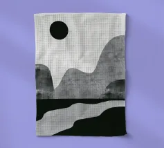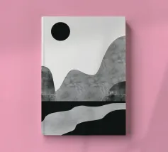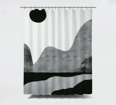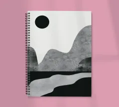 DescrizioneUn paesaggio minimalista è caratterizzato da montagne astratte grigie e da un sole nero su uno sfondo chiaro e spoglio. Una forma simile a un fiume in bianco e nero scorre lungo il fondo, aggiungendo un senso di movimento.