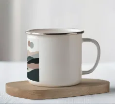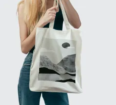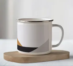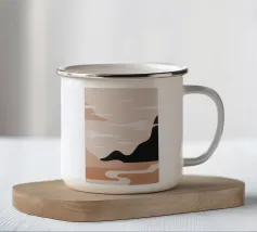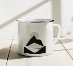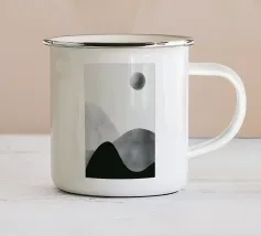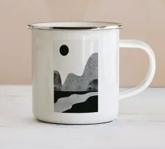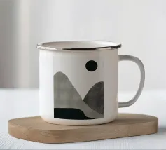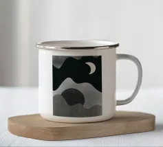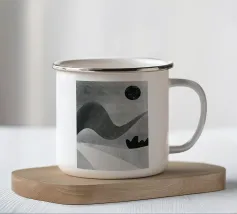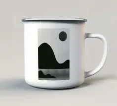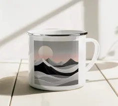 Un paesaggio minimalista è caratterizzato da colline ondulate e da un sole deciso su uno specchio d'acqua sereno, il tutto reso in toni monocromatici. Semplici forme geometriche e sfumature di grigio trasmettono una rappresentazione tranquilla e astratta della natura.
