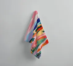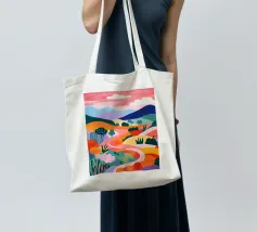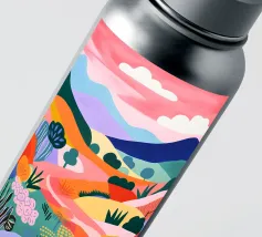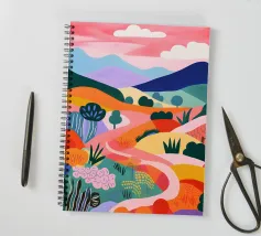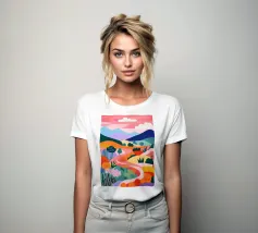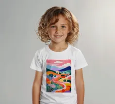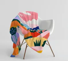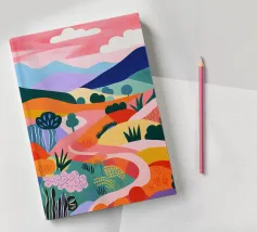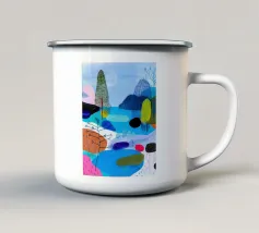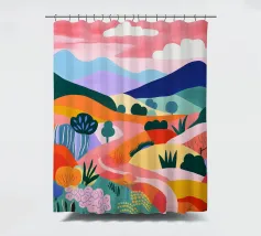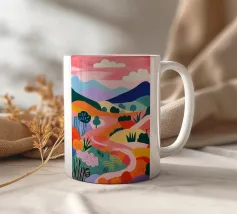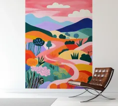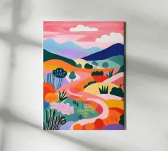 Questo vivace disegno di paesaggio combina colori vivaci come il rosa, il giallo e il blu per creare una scena armoniosa e allegra. Le forme curve delle montagne e delle piante conferiscono al motivo un tocco moderno e artistico. Perfetto per murales, cuscini, tazze o magliette - ideale per chiunque voglia portare un'atmosfera positiva e colorata nella propria casa o nella vita quotidiana.
