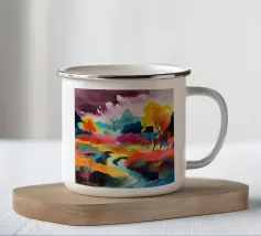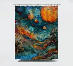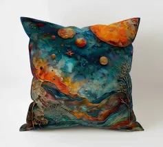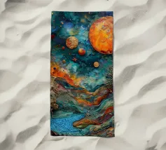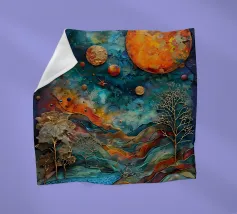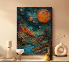 Un dipinto astratto mozzafiato che invita a entrare in un paesaggio da sogno celeste. Colori vibranti e texture intricate raffigurano un paesaggio cosmico, con una luminosa luna arancione, galassie vorticose e alberi eterei. Questo pezzo accattivante è perfetto per aggiungere un tocco di bellezza ultraterrena a qualsiasi spazio.