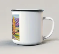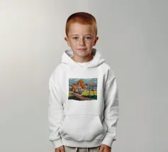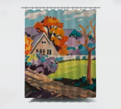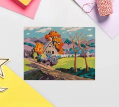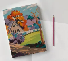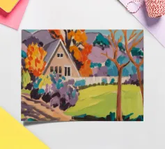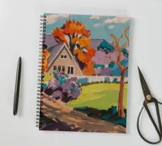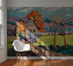 Un paesaggio espressionista che ritrae un vivace villaggio o una fattoria con edifici stilizzati in modo unico e alberi dai colori vivaci nelle tonalità dell'arancione e del verde acqua, sullo sfondo di un cielo dinamico e carico di nuvole, reso con contorni decisi e colori energici.