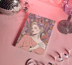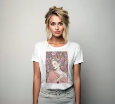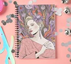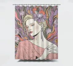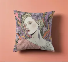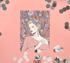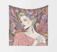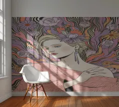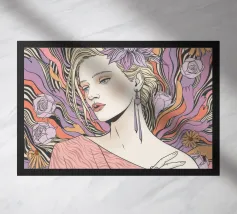 Un dipinto di una persona con capelli fluenti e colorati su uno sfondo di vorticosi motivi pastello.