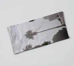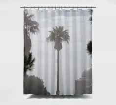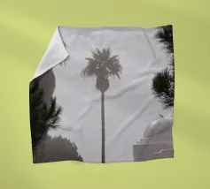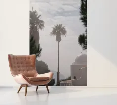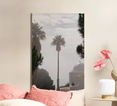 Fotografia di una palma alta e di un piccolo gabbiano su un edificio