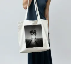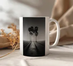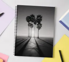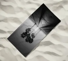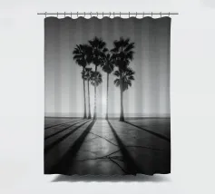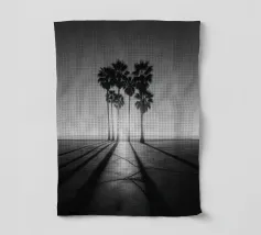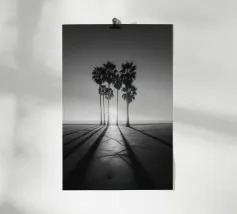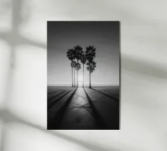Tramonto in California con questa suggestiva opera d'arte in bianco e nero, caratterizzata da una silhouette di palme che proiettano lunghe ombre sulla spiaggia mentre il sole scende sotto l'orizzonte. Perfetto per un'estetica moderna e costiera.