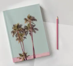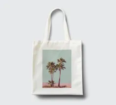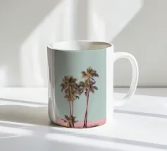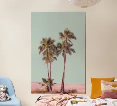 Una composizione tranquilla con eleganti palme che si stagliano su un cielo tenue e pastello e su lontane montagne del deserto. Questa opera d'arte naturalistica minimalista evoca serenità e bellezza senza tempo, perfetta per l'arredamento moderno.