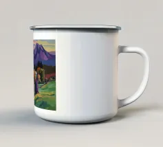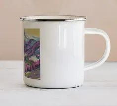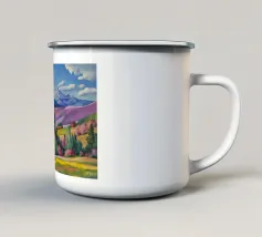 Un ampio paesaggio autunnale che ritrae dolci colline dalle vibranti tonalità di arancio, giallo e viola, punteggiate da alberi sparsi, che conducono verso maestose montagne innevate sotto un cielo limpido.
