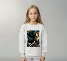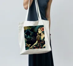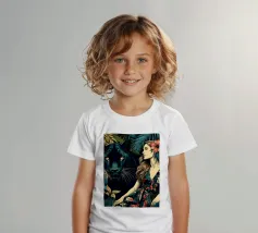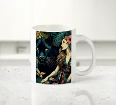 Illustrazione di una pantera nera e di una donna seduta nella giungla.