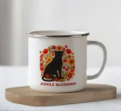 Sagoma di pantera nera circondata da fiori arancioni e rossi. Tavolozza calda, motivo floreale caratteristico; ideale per progetti audaci, tessuti grafici e accessori.