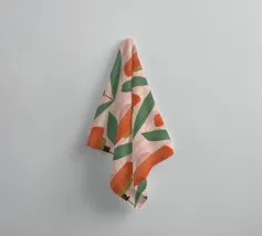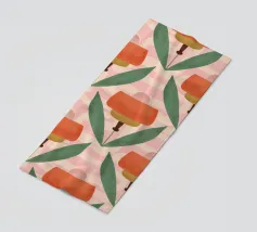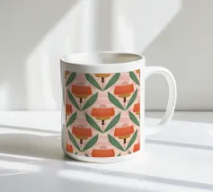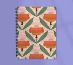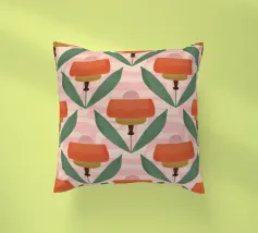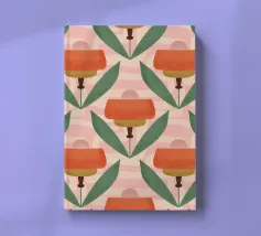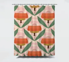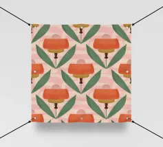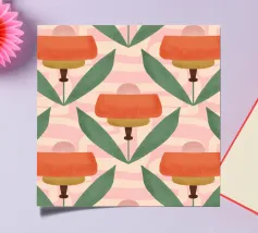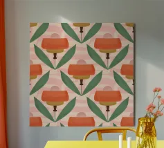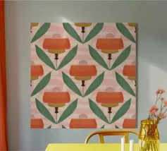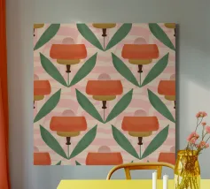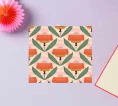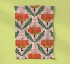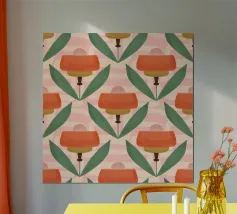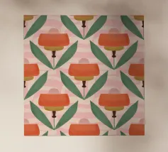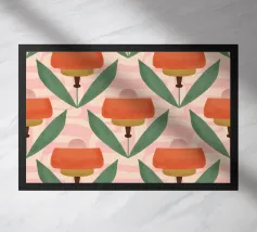 Fiore d'ispirazione moderna di metà secolo, con papaveri, foglie in grassetto e sfondo a griglia retrò nei toni smorzati dell'arancione, del verde e del beige.
