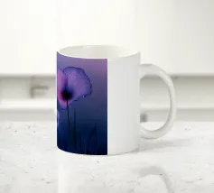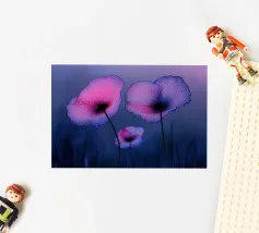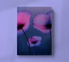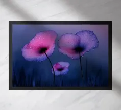 Un ipnotico murale dark vintage di Uta Naumann con delicati papaveri viola ornati da scintillanti gocce d'acqua, ogni petalo illuminato da un'eterea retroilluminazione viola. Questo disegno fotorealistico evoca un'atmosfera mistica e crepuscolare, come se fosse stato catturato nella segreta quiete del crepuscolo. Il gioco di viola intenso e di riflessi tenui crea un'atmosfera sognante e ultraterrena, che invita a un senso di tranquilla meraviglia. Perfetto per chi cerca un punto focale incantevole e misterioso che trasformi qualsiasi spazio in un santuario nascosto e crepuscolare.