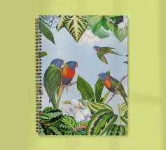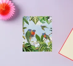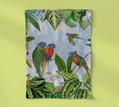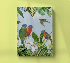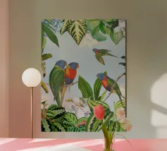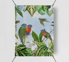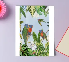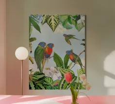 Questo suggestivo collage vintage presenta alcuni pappagalli colorati appollaiati in mezzo a un ricco fogliame tropicale, il cui piumaggio scuro contrasta meravigliosamente con il verde lussureggiante e vibrante che lo circonda. La presenza selvaggia e drammatica dell'uccello aggiunge un elemento di mistero e di intrigo. Le piante tropicali, ricche di texture e colori vivaci, creano uno sfondo dinamico, evocando un paradiso esotico e selvaggio. La combinazione di cacatua e serpente conferisce un'aria di selvaggia eleganza, fondendo la bellezza grezza della natura con il fascino vintage.